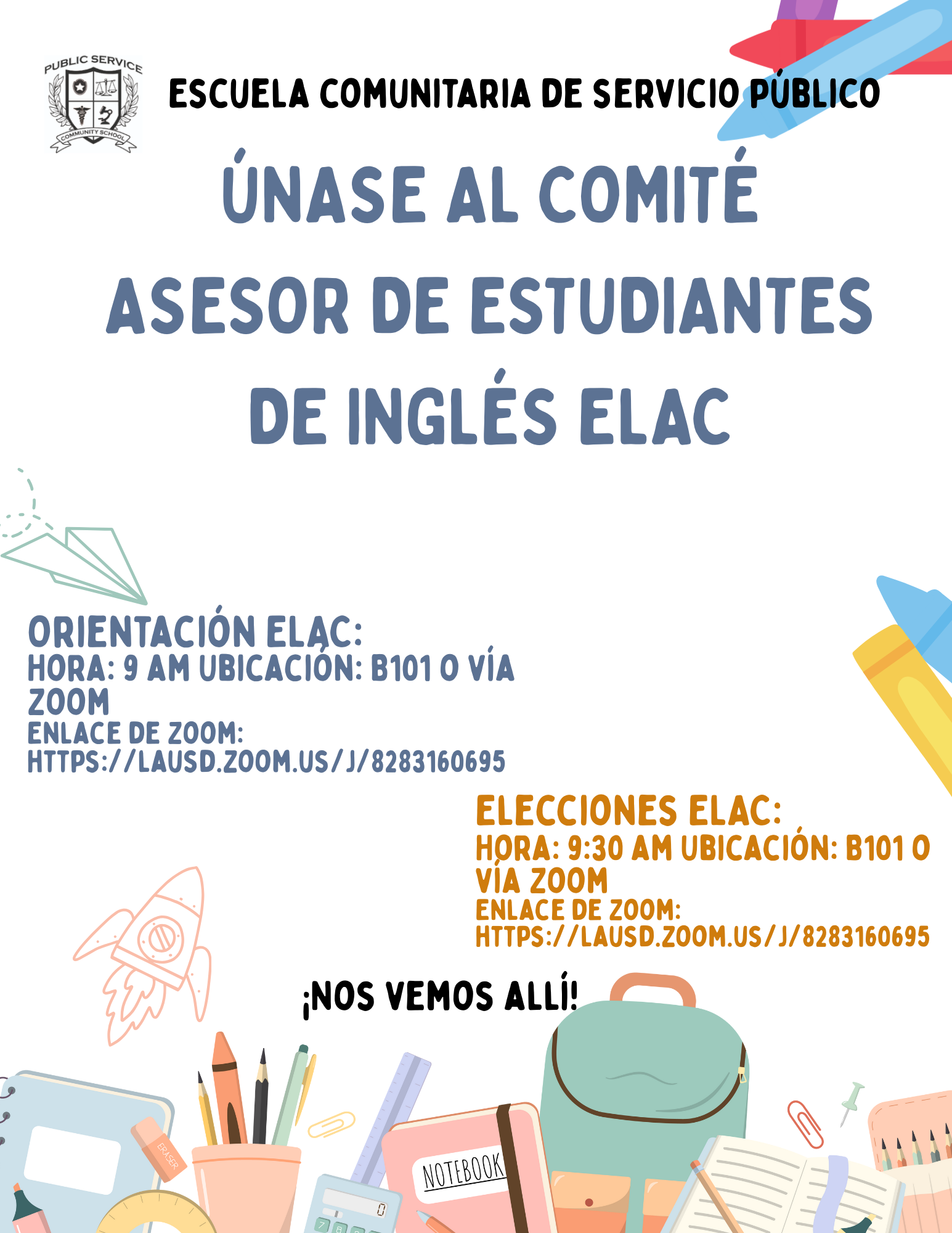 El martes, 3 de septiembre, Public Service llevará a cabo Orientaciones y Elecciones de ELAC. Por favor asista a la reunión para saber cómo participar y convertirse en miembro de este comité.
